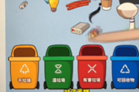 垃圾分类上关卡是物品归类关卡,要求我们在游戏时间内将所有的垃圾进行归位,本关卡的垃圾箱有四个,需要玩家根据自己的了解将全部垃圾归位到正确的垃圾箱中。